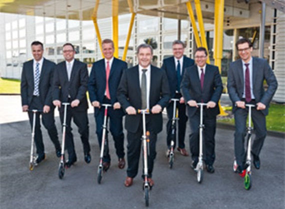 : Tobias Vogel, Jefe de Ventas y Marketing Cojinetes; Michael Blaß, Vicepresidente, Jefe de Ventas y Marketing Sistemas de Cadenas Portacable; Frank Blase, Director Ejecutivo; Gerhard Baus, Vicepresidente, Jefe de la Unidad de Negocios Cojinetes de Polímero; Artur Peplinski, Vicepresidente, Jefe del Grupo Internacional de Desarrollo y Marketing; Harald Nehring, Vicepresidente, Jefe de la Unidad de Negocios Sistemas de Cadenas Portacable; Christoph Müller, Vicepresidente, Jefe de Finanzas y Control