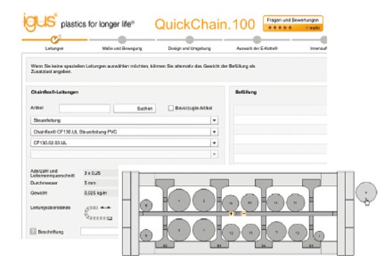 igus® presentó la primera Cadena Portacable fabricada de plástico hace 43 años. Hoy la compañía ofrece la más amplia gama de cadenas de plástico con la variedad de cables flexibles más amplia del mundo. Para navegar a través de la amplia gama, los clientes pueden utilizar una herramienta online para seleccionar fácilmente su cadena con cables y conectores e incluso calcular la vida útil. Actualmente, igus® es un proveedor de sistemas de suministro de energía. Los sistemas readychain® se ofrecen como unidades terminadas, ensambladas por encargo.