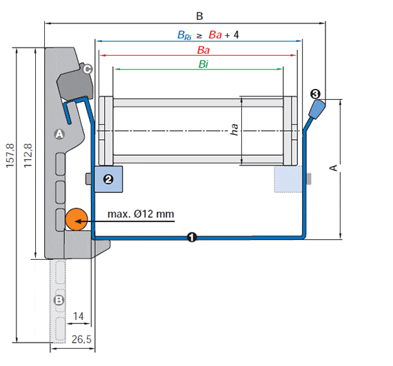 | Referencia | Para cadenas portacables: | con o sin | Anchura interior del carril | A | B | |||