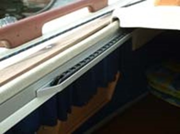 The installation of the solar module was done in an E2 micro energy chain of the Series 04. For guiding, the e-chain® was embedded in an aluminum U profile. The connecting cable of the solar module thereby runs in the energy chain. The energy chain runs unsupported underneath the sliding hatch along with the sliding hatch and protects the connecting cables from external influences.