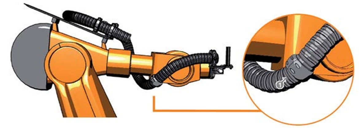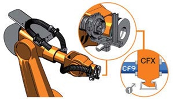 Fijación en el eje adicional montado sobre el robot. Descarga de tensión mediante abrazaderas de descarga de tensión CFX en el raíl en C doble.