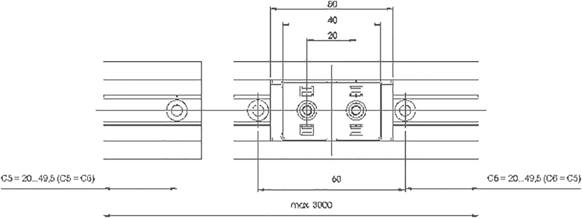 | Nº de art. | Longitudes de raíl máx. | a | C4 | A3 | C5=C6 | h | h1 | K1* | ly | lz | Peso del raíl | Precio/m | ||