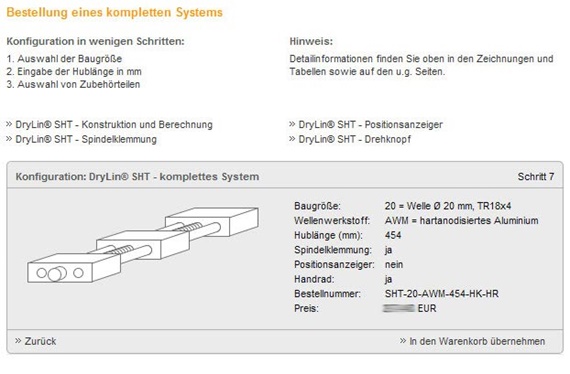 Con el propósito de mejorar el diseño de los sistemas lineales drylin® para las aplicaciones individuales de los clientes, está previsto de insertar dicho configurador en las páginas de producto de referencia. Ahora se pueden configurar las guías lineales drylin® T las guías de bajo perfil drylin® N y las mesas lineales con husillo drylin® SHT . La longitud individual, los posibles ajustes de holgura y los accesorios opcionales se definen en el mismo tiempo, de acuerdo a los requisitos.