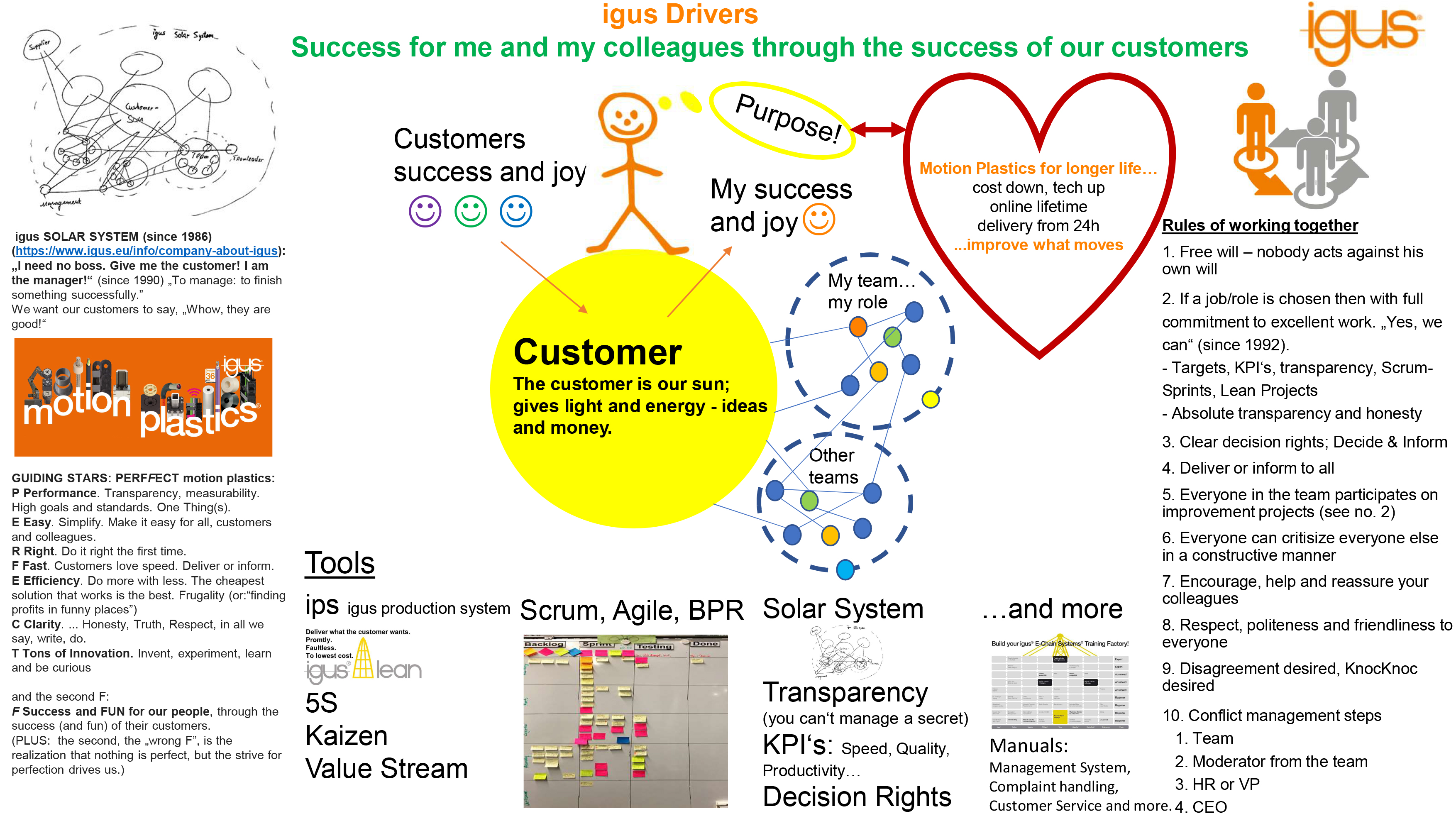 En igus, todas las actividades giran en torno al cliente. El cliente es tan importante para nosotros como el sol lo es para la vida en nuestro planeta. El sol proporciona luz, calor y energía. El cliente nos aporta ideas, trabajo y nos permite crecer y progresar. El sistema solar de igus está firmemente arraigado en nuestra filosofía corporativa. Los empleados y equipos orbitan alrededor del cliente como planetas, escuchan sus deseos y encuentran una solución a sus problemas. Si el cliente está satisfecho, nosotros también.
