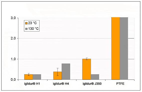 Las características de desgaste de todos los materiales iglidur® probados son significativamente mejores que las del cojinete de PTFE. A 130 °C, la tasa de desgaste del cojinete de PTFE es de 55,7 µm/km, y de 0,3 µm/km para el iglidur® H1.