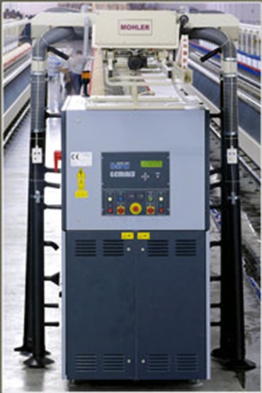 Travelling cleaners are installed in these textile machines to suction off fluff and waste during spinning or weaving. The cleaners move from one end of the machine to the other at a speed of up to 16 metres per second over a distance of 70 metres. Before an e-chain® was used, the power cable regularly became tangled, leading to short-circuits and cleaner downtime. The e-chain® has put an end to the problem.